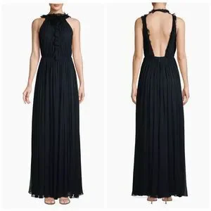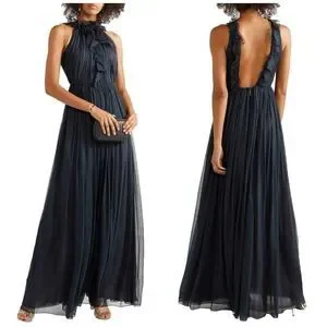 Crafted in delicate lightweight silk, this gathered halterneck gown is trimmed with a ruffled halterneck that adds cascading texture to the piece.