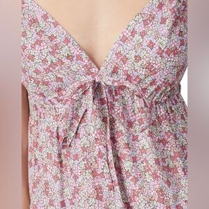 This is a cute spaghetti straps dress w/ a floral design that has faint sparkly silver threads throughout. 100% cotton lined w/ cotton. Straps are adjustable. Cute bow tie in front. It’s giving rich hippie/ prairiecore. Ptp measures 17” w/ a stretchy panel in back. Size M. No flaws. Cottagecore