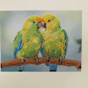 This is a finished diamond art picture. It is a picture of a 2 Love Birds on a Branch. The picture is 7 3/4" by 6" This was done with a diamond are kit. This picture can be put in a frame or mounted on a canvas and hang on your wall. It is a great picture to add to your home decor. This unique art in done on a cardboard with round resin rhinestones.