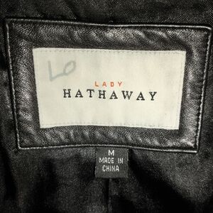 Women's 4-button long black leather jacket. Size Medium. 40" chest, 29" long, 24" sleeves. Soft, buttery leather. Fully lined. Side pockets. Slight shoulder pads. Minor scuffs.