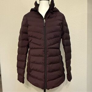 Women’s fitted puffer jacket with hood and pockets. Perfect jacket to throw on with jeans or your comfy cozy lounge set to run errands or head to class in.