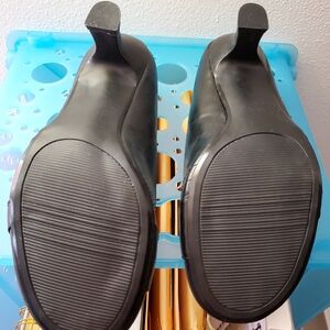 Stylish black heels with a decorative buckle. Features a colorful floral insole. Perfect for casual wear.