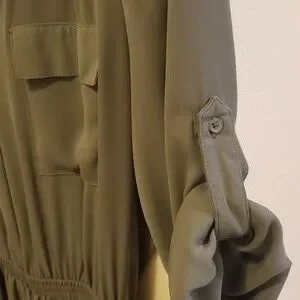 Dress has a stretchy elastic waist. The sleeves can be unrolled or rolled.