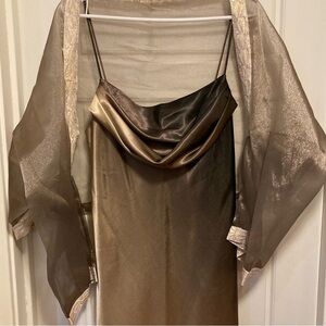 Beautiful, sleek sheath gown with spaghetti straps. Fully lined. Organza wrap had sleeves and embroidery trim. Color is gradient from chocolate brown to gold. Fabric is slightly stretchy.
