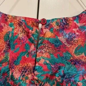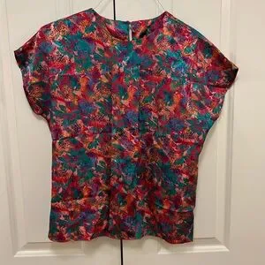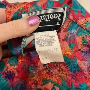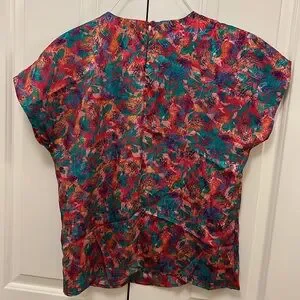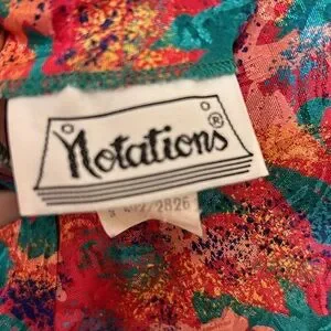 Vintage multicolor pattern Notations short sleeve blouse, size 4. The colors are gorgeous and there is a reverse pattern shine throughout