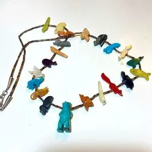 VTG Zuni Native American Turquoise Bear Carved Gem Animals Fetish Necklace 24”
