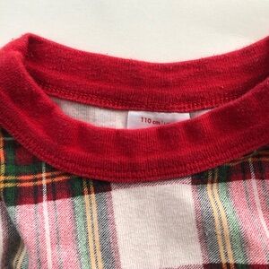 Cozy plaid pajama set. Features red cuffs and collar. Perfect for lounging and sleeping.