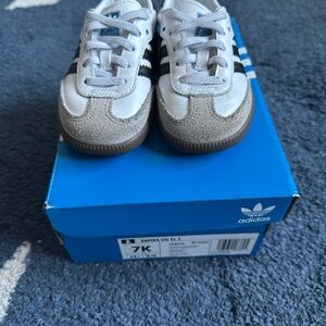 Toddler Classic Adidas sambas. Features iconic stripes and slide on access. Perfect for casual wear.