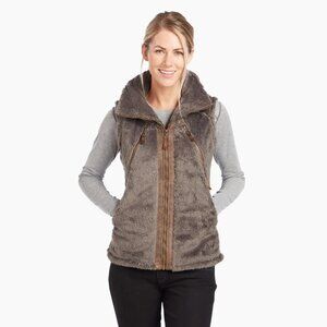 The KÜHL FLIGHT VEST for women provides superior warmth and softness with a 100% premium mid-weight Italian fleece. The stylish two-tone details and stowaway hood make it ideal for chilly nights around the campfire. Four zip pockets provide secure storage.