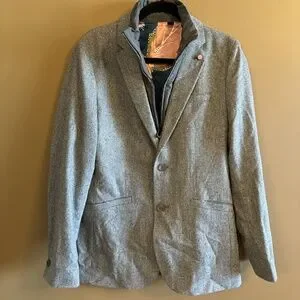 This chic Ted Baker blazer features a classic notched lapel and a refined gray herringbone pattern, making it a versatile addition to any wardrobe. Perfect for formal occasions or pairing with casual outfits, this blazer stands out with its unique style and craftsmanship, enhanced by a removable hood and a two-button closure.