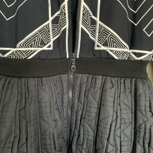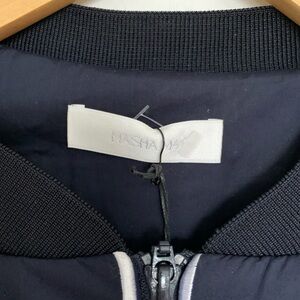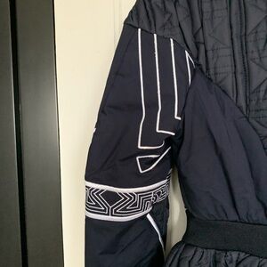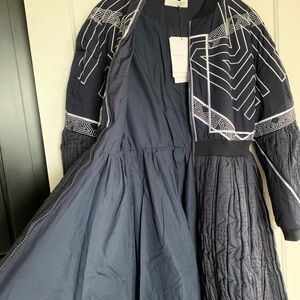 Inky navy coat - with white trimmings and incredible detail from Chinese designer. Examine photo carefully for full effect. Waisted with full quilted skirts with pockets and double zip. Length 42 inches, waist 151/2 pit to pit 18 inches. If you are looking for something beautifully made this is it. New.