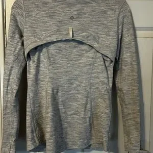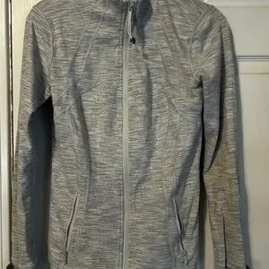 Chic heathered gray jacket with a zip-up front. Features a stylish high collar. Ideal for active and casual outings. Color is on lighter side of heathered gray. Thumb holes in sleeves.