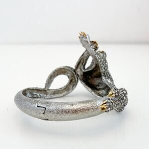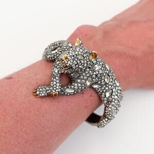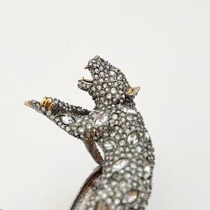 Crystal Moonlight Resting Panther bracelet bangle by Alexis Bittar. Encrusted crystals, gold and silver-tone metals, hinged magnetic closure. Hinge closure in a gunmetal finish. Preowned condition. No missing crystals. Minor scratches and wear throughout metal.