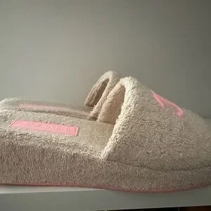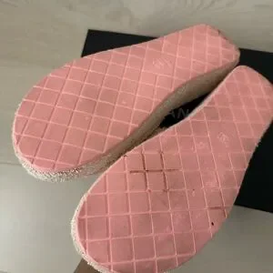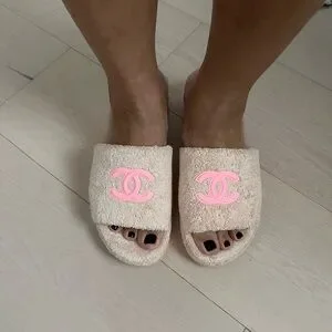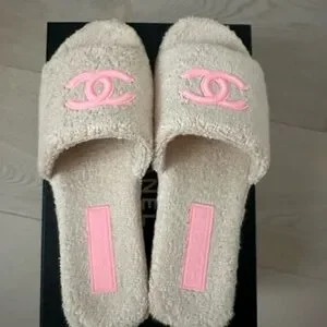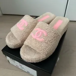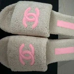 Chanel slides with a soft terrycloth texturei. A light link and Pink coco stitching mark