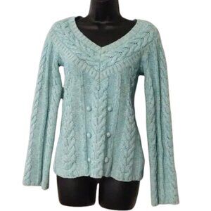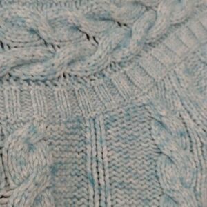 V neck. Very thick and warm. Full long sleeves. Gorgeous knit pattern. Armpit to armpit 17". Length from top of shoulder to hem of sweater is 24".