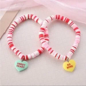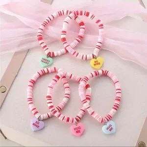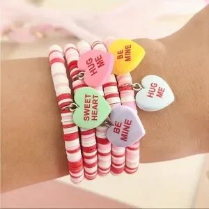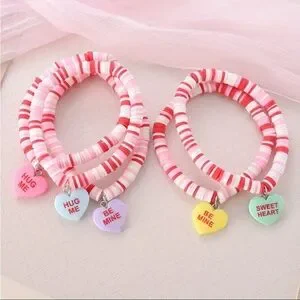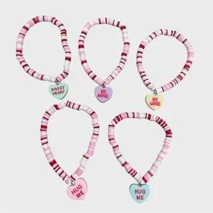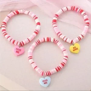 Set of vibrant bracelets with heart charms. Features phrases like 'Hug Me' and 'Be Mine'.