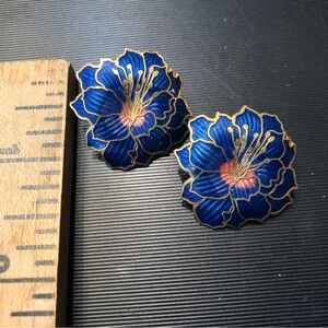 Vintage Cloisonne Blue Enamel Hibiscus Earrings / Pierced Studs/ Goldtone Flower