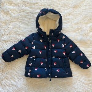 Toddler puffers jacket in excellent condition never worn. Size 2T color blue with red & pink hearts