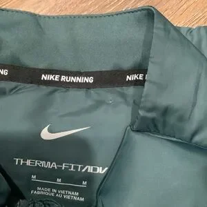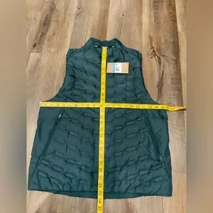 Elevate your outdoor experience with the Nike Therma-FIT Down Fill Repel AeroLoft Running Vest. Tailored for a regular fit, this men's size medium vest is designed to keep you warm without the bulk, featuring a sleek teal color that easily pairs with your existing workout wardrobe. The polyester microfiber construction ensures durability and a lightweight feel, perfect for transitioning seasons. Engineered for a variety of activities including running, jogging, and hiking, this vest boasts a stand-up collar, full zip closure, and zipped pockets for convenience and warmth. The down insulation offers excellent cold-weather protection, while the water-resistant fabric shields you from the elements. Whether you're on a casual walk or tackling a crossfit workout, this Nike vest is an essential layer for versatile performance.