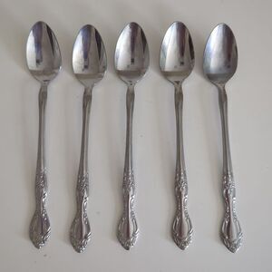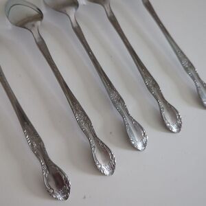 Lot set of 5 Long Elongated Robertcraft Stainless Korea Iced Tea Spoons Flatware Silverware Floral Vtg vintage MCM mid-century modern.