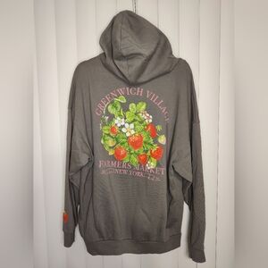 Hi Res grey New York Greenwich Farmers market pullover hoodie with strawberry design and front pockets. Good condition, size large