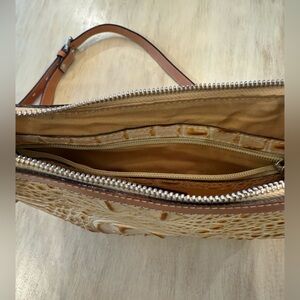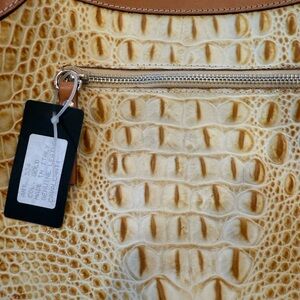 Made in Italy of croc finish leather by Cavalcanti. Adjustable strap. Zipper close. Exterior zipper pocket. Several interior pockets including one zip pocket. Lightly used. Tags have been removed and bag was lightly used. 11”w x 3”d x 12”h