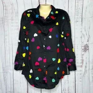 New York & Company Size L Black - Multi-Color Heart Print Button Down Shirt. Collar. Round Hemline with Side Slits. Roll-Tab Sleeves. Cotton/Spandex Blend.