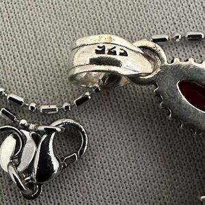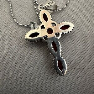 This cross is marked 925 and has carnelian stones. The chain is also marked 925. It measures 1 3/4” long x 1 1/8” wide. The chain is 17”. In excellent condition.
