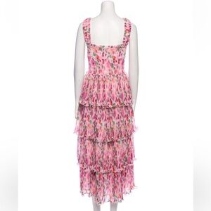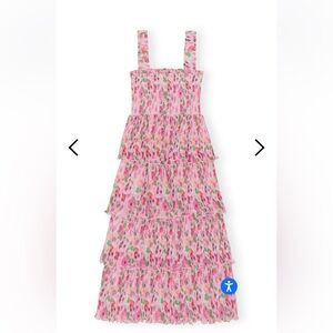 This Pleated Georgette Smock Midi Dress is made from certified recycled polyester. The dress is designed for a form-fitting silhouette and features a square neckline, elastic straps, a smock bodice and a tiered flounce skirt.