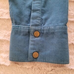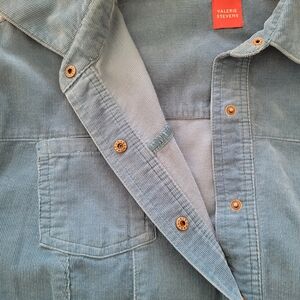 Beautiful light weight top with snaps down front and at cuffs. Turquoise color. Can be a shirt or a cover shirt. Vintage vibe by Valerie Steven's. 100g cotton. very soft