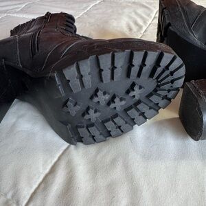 Steve Madden Lead Heeled Boots, Side-Zip Lace-Up, Lug Soles, Black Leather, Size 7.5. Good used condition with some scuffing. See pics for details.