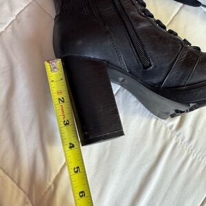 Black boots, lace-up boots, chunky heel, leather boots, combat style, platform heel, edgy, grunge style, side zipper, lug sole, versatile, statement boots, durable, chic, modern, trendy, street style.