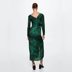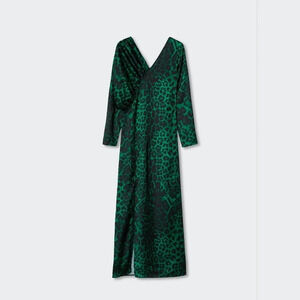 Flowy fabric. Satin. Animal print. Midi design. Tailored design. Evasé design. V-neck. V-neckline in the back. Long sleeve. Draped panel. Opening in the lower front. Invisible lateral zip fastening. Party and events collection.