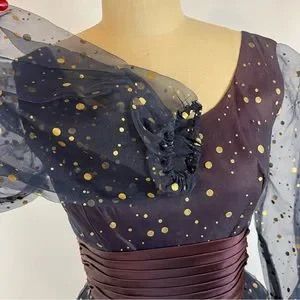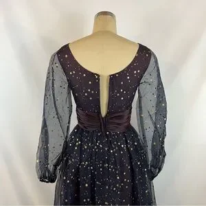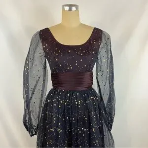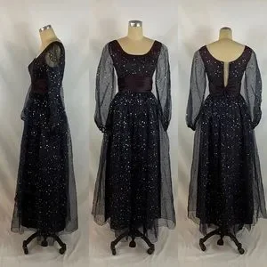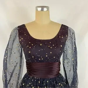 Spectacular vintage 1950s formal gown in a lovely navy chiffon top layer with gold metallic polka dot over A line skirt and bodice. Sheer balloon sleeves with gathered elastic cuffs. Satin ruched sash cinching waist. No brand or size tag, fits size small. Full sheer overlayer top of skirt, zipper back. Light fading on sash and bottom layer. Minimally noticeable. Truly stunning gown.