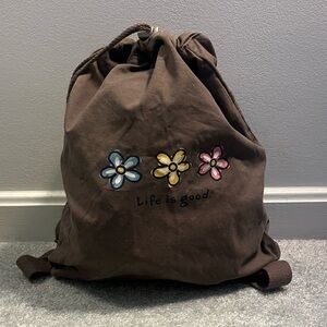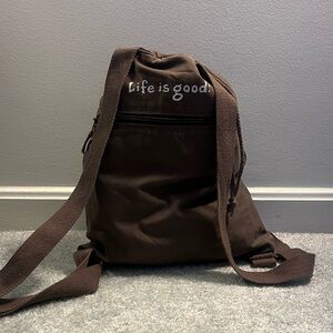 This is a pre-owned Medium Cotton drawstring backpack from Life is Good. This brown cotton backpack with metal hardware and adjustable straps has one exterior zip pocket. The inside of the backpack is clean, spacious, and in great shape. The exterior is in excellent shape with no scratches or imperfections.