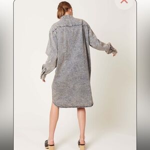 cool acid wash denim shirtdress. Makes a great layering piece and pairs well with tall boots. Button closure and pockets.