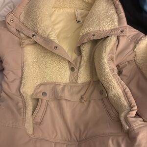 Pullover in a Sherpa combo with a tan color… this is a bit oversized and has front button closure… has a kangaroo pockets and has drawstrings… this is soft and very stylish and has slits on the sides… the hem is rounded