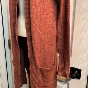 Long cardigan sweater, size XS, fits like a small, nice light weight sweater, very comfortable, pockets and side pleats, 33” from pit to bottom hem, slight stretchy material