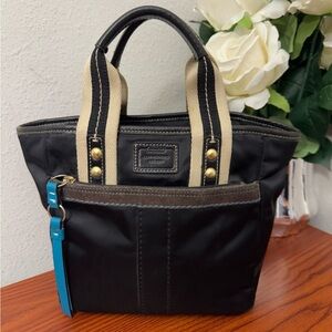 Coach Small Bag = Black Satin with blue tags