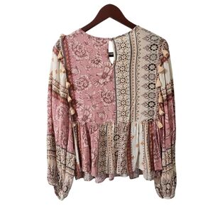 SOLD-American Eagle Pink Patchwork Peasant Top Boho Embroidered Tassel Flare M