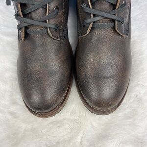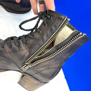 Excellent condition! The upper is literally 'perfect,' in it original (factory distressed) condition, not even a hit of bend in the toe. Interior label also pristine. Really only sign of wear is on the heel caps. Heeled combat/biker style boots. Freebird's distressed 'black,' which has black-brown look. These are some of my favorite Freebird boots in general! Perfect heel height to dress up or down, and soft leather for endless comfort.