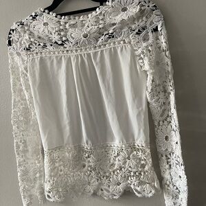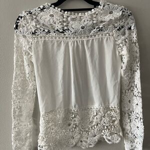 Preowned condition sheer, see through lace white blouse. No major signs of wear.