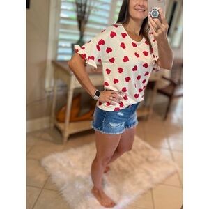 Girly heart print flutter sleeve, drop shoulder and round neck. Perfect for Valentine's Day or date night. Lightweight french terry.