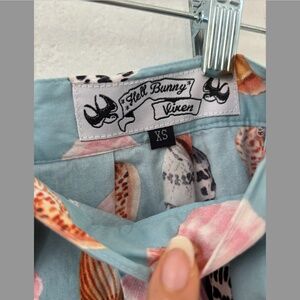 Seashell skirt by Hell Bunny. Size XS. A couple small flaws as seen in photos, small stain at waistband and thread pulling on side seam. Has pockets, back zipper closure with a button. Retro pinup girl style.
