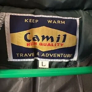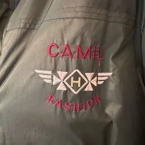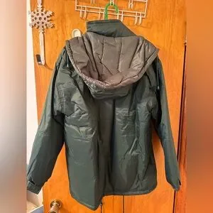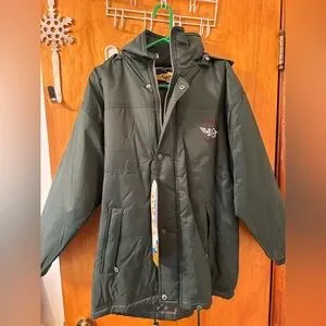 Stylish green jacket with a hood. Features a front zipper and snap buttons. Embroidered logo on the chest. Perfect for outdoor activities.
