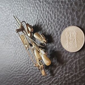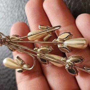 Pretty silver toned vintage brooch with clear crystals and faux pearls- approx 3" by 1.25"- a few crystals show minor darkening- price reflects condition