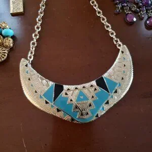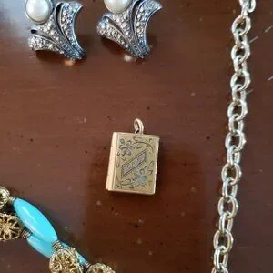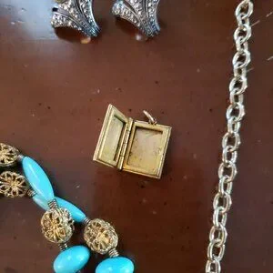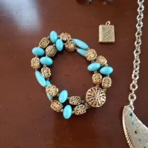 Tags: jewelry, necklace, bracelet, earrings, chandelier, clip on, locket, book, teal, blue, gold color metal, art deco, bohemian, unique, costume, vintage, boho,