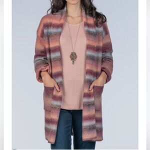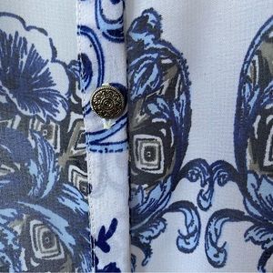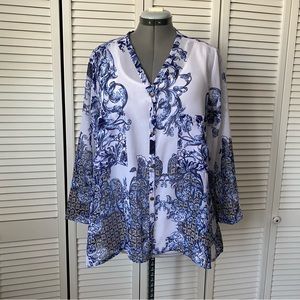 Lovely sheer blouse with bold large print detail. Button front with metal buttons. 2 front pockets. Full length sleeves with slit detail with button. Flared shape creates pointed detail at hem on side seams. Sheer fabric, best worn over a cami or tank. Shown over white tank- not included.