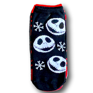 3-Pack of Funny Novelty No-Show Socks. The Nightmare Before Christmas Jack Skellington Santa designs. From the famous Disney Tim Burton film, "The Nightmare Before Christmas". Gray, black, white & red colors. Disney brand. Brand new with tags attached. Great for gifts, stocking stuffers, & Easter baskets!