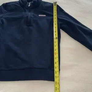 Navy blue Vineyard Vines 1/4 zip sweater, size small in good pre-owned condition. No holes or stains. Some minor piling of the fabric. Body is 77% cotton, 23% polyester. Measures approximately 17” across the chest and 22” from shoulder to hem.